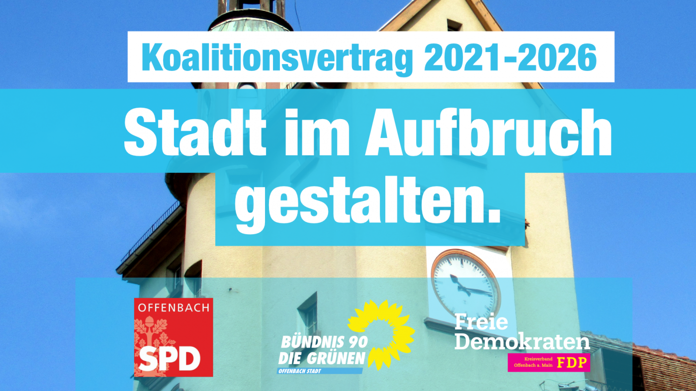 Offenbach ist eine Stadt im Aufbruch. SPD, GRÜNE und FDP wollen gemeinsam eine Koalition des sozialen, wirtschaftlichen und ökologischen Fortschritts bilden, um die Entwicklung der letzten Jahre fortzusetzen. Wir möchten einen offenen, an der Sache orientierten Politikstil pflegen und die Bür- ger:innen an den politischen Prozessen beteiligen.